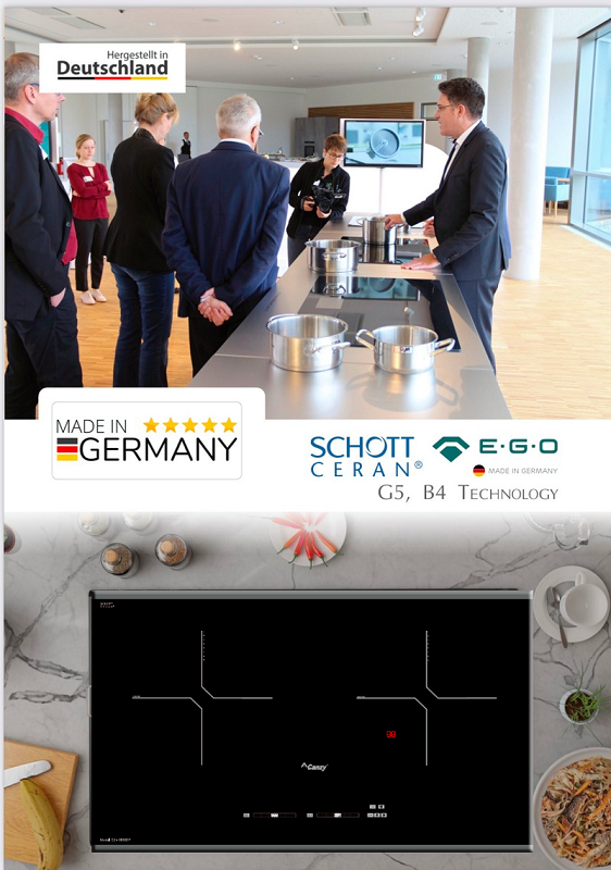 • Bếp đôi: 2 vùng từ, sử dụng mặt kính Schott Ceran vát 2 cạnhbo góc Sử dụng mâm từ E.G.OGermany tiêu chuẩn đạt chất lượng EMC, CE.
