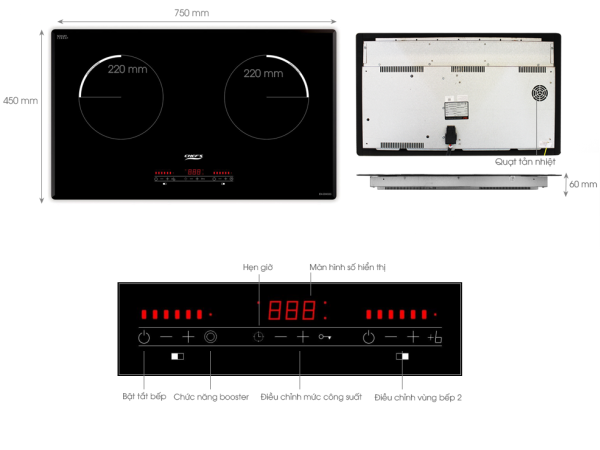 Chức năng chia sẻ công suất của hai vùng nấu tối đa 3600W: Khi một vùng nấu hoạt động ở mức công suất cao, vùng nấu còn lại sẽ tự động điều chỉnh giảm để đảm bảo tổng công suất bếp không vượt quá 3600W, bảo vệ cho các thiết bị điện khác trong gia đình không bị quá tải đường dây.