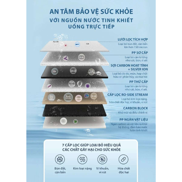 Cấp lọc RO-SIDE STREAM: Loại bỏ kim loại nặng, hóa chất độc hại, vi khuẩn, vi rút.