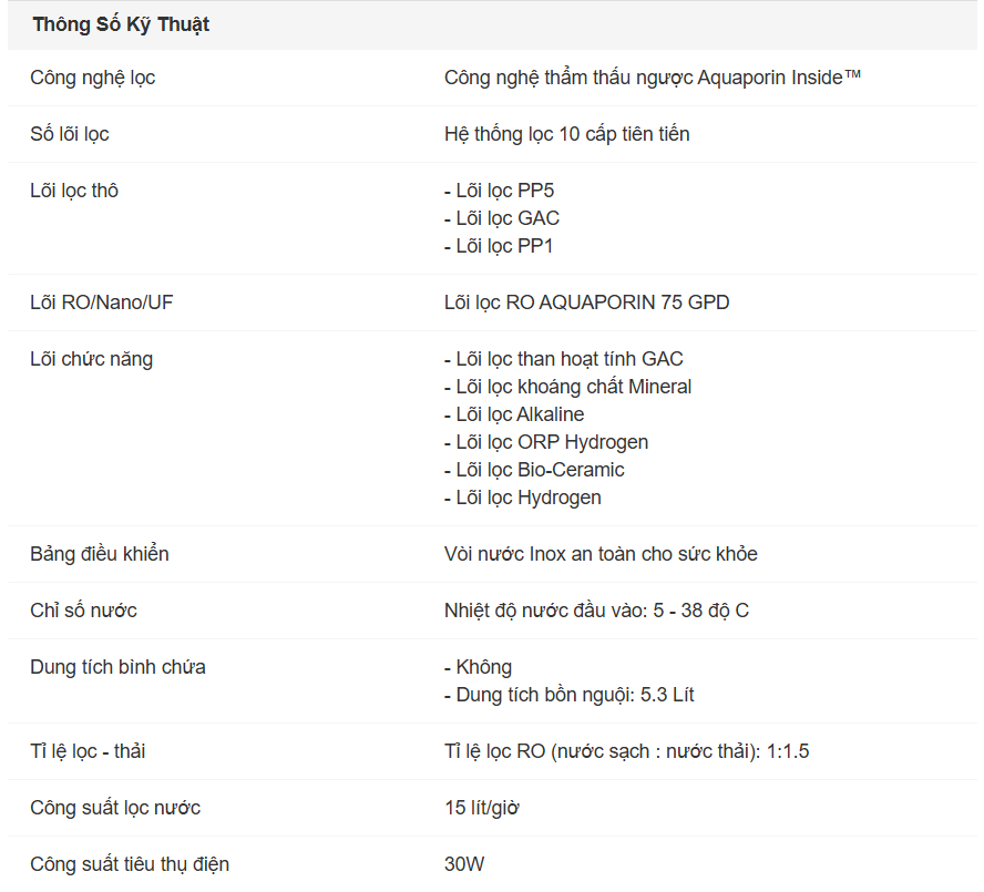 - Công nghệ thẩm thấu ngược Aquaporin Inside™ lọc sạch tới 0,0001 micron và hơn 110 chất gây hại có trong nước