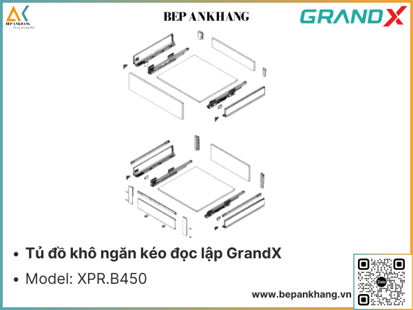 Một tính năng đặc biệt của tủ GrandX Sirius XPR.B450 là khả năng tùy biến kích thước ngăn kéo thông qua việc điều chỉnh mặt cánh tủ trước. Bạn có thể thay đổi kích thước ngăn kéo từ 500mm đến 900mm, phù hợp với nhu cầu lưu trữ và không gian bếp của mình.