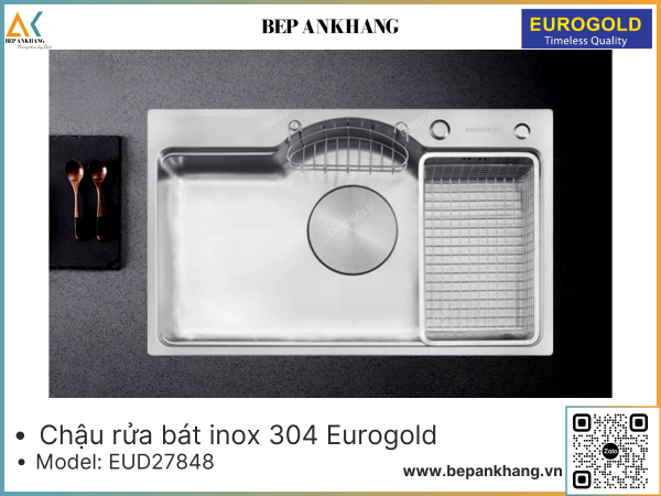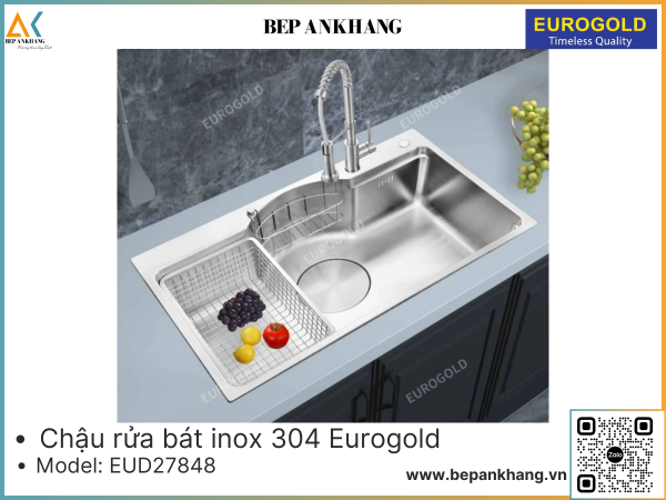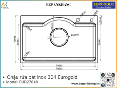 • Chậu rửa  Eurogold EUD27848 sáng bóng bền màu, chống oxi hóa, an toàn cho sức khỏe với chất liệu INOX SUS304 tiêu chuẩn cao.