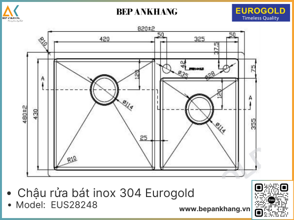 Sản phẩm EUS28248 sáng bóng bền màu, chống oxi hóa, an toàn cho sức khỏe với chất liệu INOX SUS304 tiêu chuẩn châu Âu